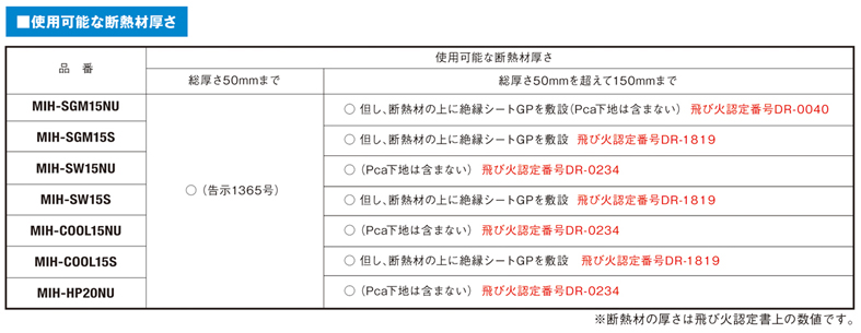 下表に飛び火認定番号と使用可能な断熱材の厚みをまとめた表を掲載しております。