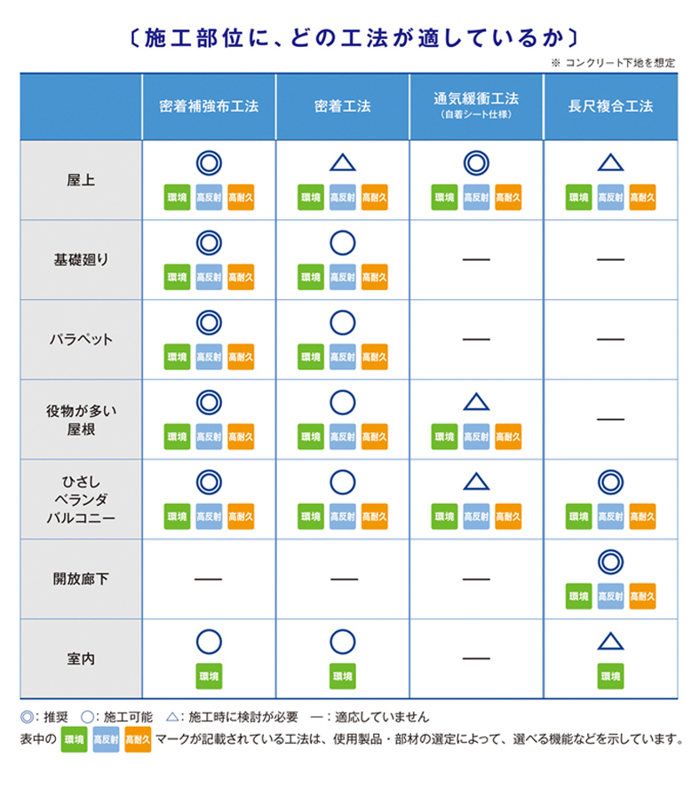 アクシスコート防水システムでは、多数の工法がありますが、どの工法がどのような場所の施工に適しているのでしょうか?